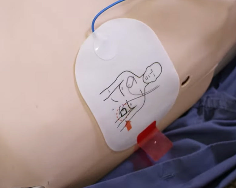The HeartStart's voice instructions and pads themselves show you exactly where to place them on the patient's chest. One pad goes on the upper right chest, and the other goes on the lower left side. The patient's chest must be bare and dry for proper pad contact. The AED will automatically begin analyzing the heart rhythm once the pads are correctly placed.